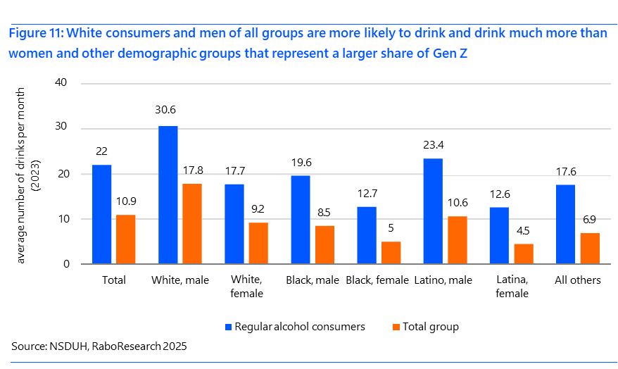 La Generación Z es más diversa racial y étnicamente que las generaciones anteriores, y las mujeres representan la mayoría de los consumidores de la Generación Z que beben alcohol; estos grupos de consumidores beben menos que los consumidores blancos y los hombres, respectivamente. El impacto de esta tendencia deprimirá el consumo total de alcohol de la Generación Z, incluso a medida que este grupo envejezca. De hecho, el «quién» bebe puede influir significativamente en el consumo a nivel poblacional, como ilustra de manera clara la figura 11.