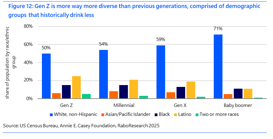 De manera similar, la composición étnica/racial de la Generación Z es otro factor que contribuye a sus niveles más bajos de consumo de alcohol. Los consumidores negros, asiáticos y latinos históricamente beben menos alcohol que los consumidores blancos. Estos grupos representan el 50% de la Generación Z, mientras que sólo representaban el 29% de la generación de los baby boomers (ver figura 12).