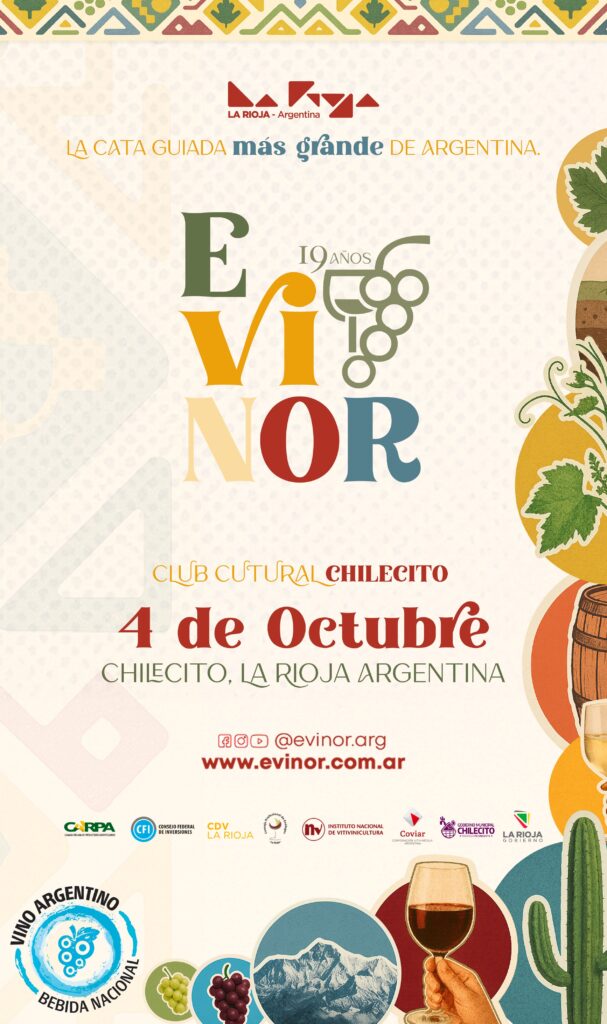 En esta 19ª edición, la Evaluación de Vinos del Noroeste Argentino (Evinor) consolida su reputación como espacio de promoción, difusión y reconocimiento de los vinos elaborados en La Rioja, Catamarca, Salta, Tucumán, Jujuy y Córdoba. Lo que comenzó como un encuentro regional, hoy es una cita de referencia nacional e internacional, y cuenta con el acompañamiento institucional de la Corporación Vitivinícola Argentina (Coviar), el Consejo de Enólogos de La Rioja, la Cámara Riojana de Productores Agropecuarios (Carpa) y el Centro de Desarrollo Vitícola La Rioja, y el apoyo de organismos como la Organización Internacional de la Vid y el Vino (OIV), el Instituto Nacional de Vitivinicultura (INV), el Consejo Federal de Inversiones (CFI), el Fondo Vitivinícola de Mendoza, Gobierno de La Rioja, Cámara de Bodegueros de La Rioja y Gobierno Municipal de Chilecito.
