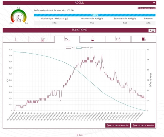 EVOferm2® permite la monitorización en tiempo real, la gestión de parámetros y la dosificación de nutrientes y oxígeno de forma sencilla e inmediata, mientras que ADCML® representa la solución más innovadora para monitorear, en línea y en cada tanque de la bodega, la cinética del consumo de ácido málico y la actividad de las bacterias lácticas durante la fermentación maloláctica.