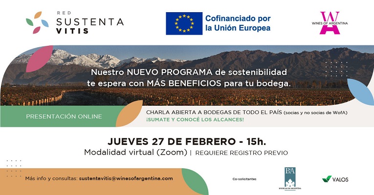 Con el objetivo de dar detalles sobre su programa integral de sostenibilidad para el sector vitivinícola «Sustenta Vitis», Wines of Argentina (WofA), invita a bodegas de todo el país a una charla on line, el 27/2 a las 15 hs. Este programa permite potenciar la estrategia de promoción del Vino Argentino gracias a diversas iniciativas asociadas a la sustentabilidad social, ambiental y económica.
