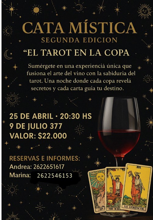 El 25/4 desde las 20.30 hs, en la ciudad de Tupungato, Valle de Uco, Mendoza, se realizará la 2° edición de la Cata Mística «El tarot en la copa». Es una ocasión especial para conocer cómo cada vino y cada copa pueden revelar secretos sobre tu personalidad, y cómo cada carta, con la correcta interpretación, puede guiar tu destino. Los cupos son limitados y la entrada tiene un valor de $22.000, que incluye la degustación de 3 vinos con sus respectivos maridajes de exquiciteces regionales.