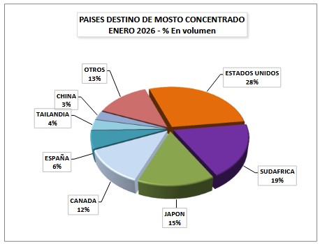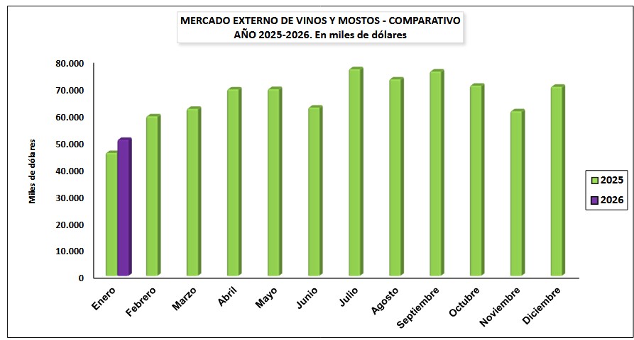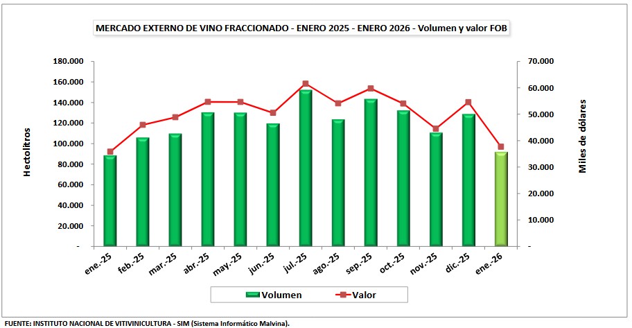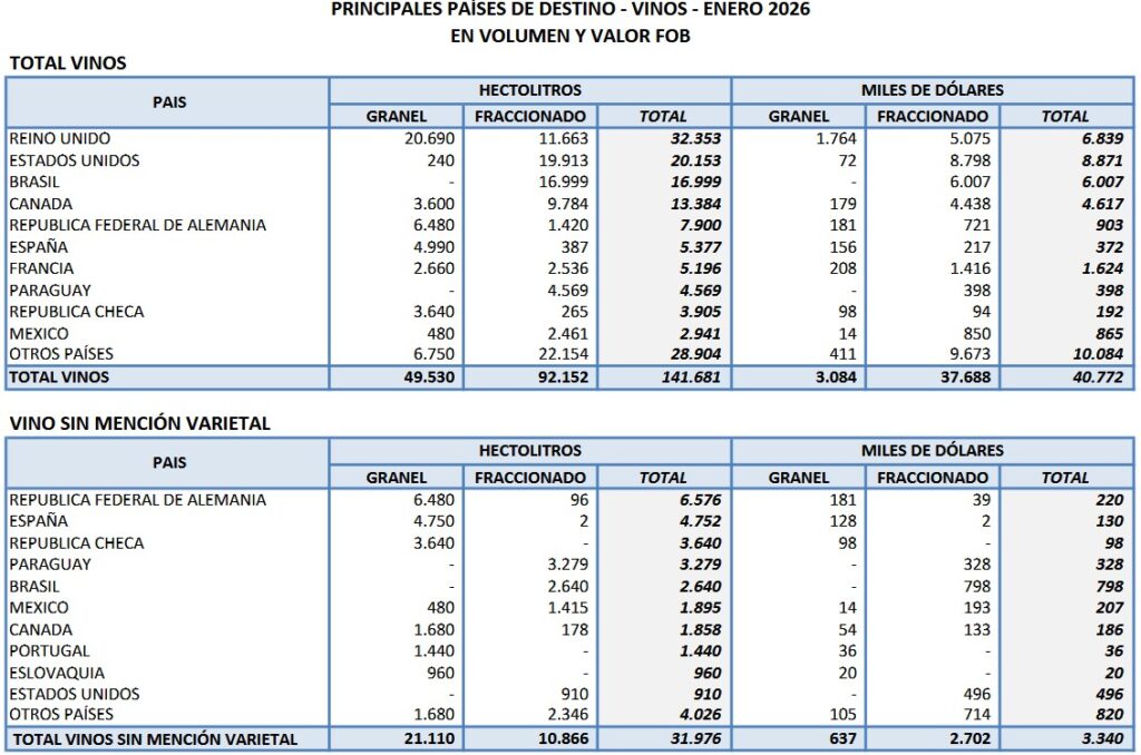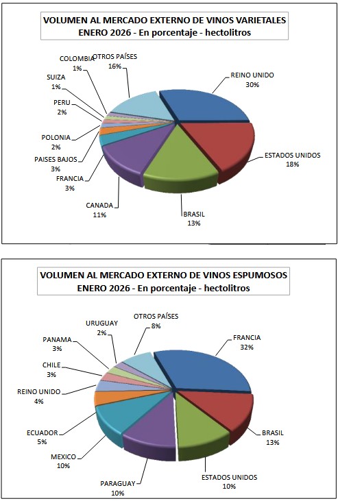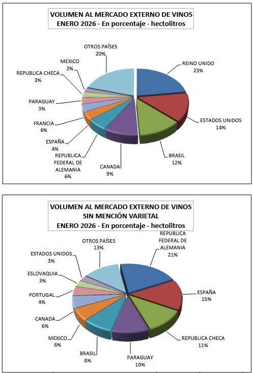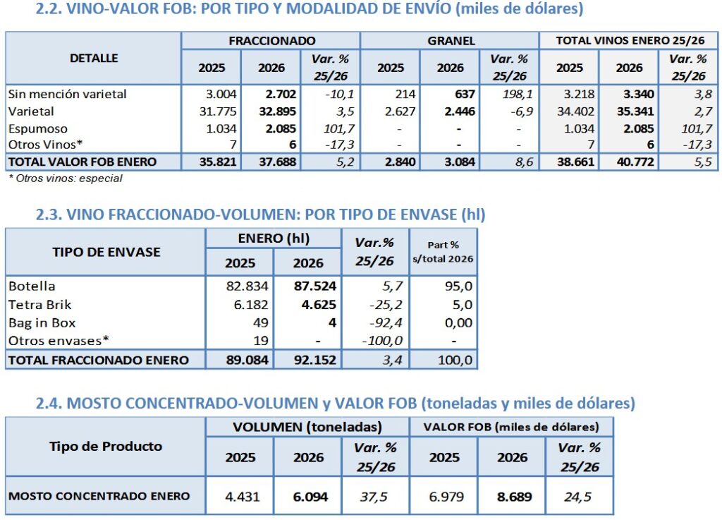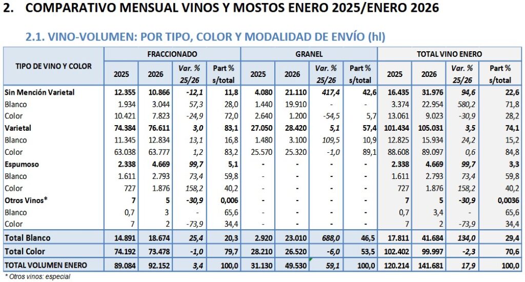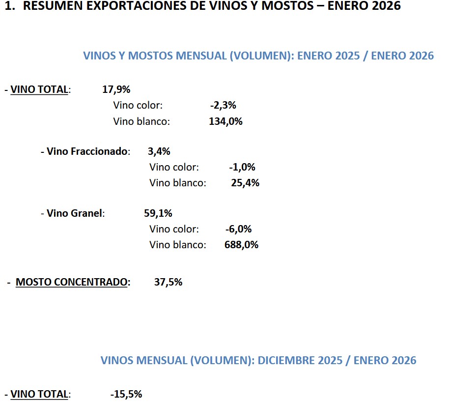 Las ventas argentinas de vinos al exterior en enero de 2026 se recuperaron un 17,9% comparadas con las de enero de 2025. Sin embargo, de diciembre 2025 a enero 2026 cayeron 15,5%. En esta relativa mejoría global de enero 2025 a enero 2026 se destacan el crecimiento del 134% en volumen del vino blanco; el del granel un 59,1% y el del mosto un 37,5%.