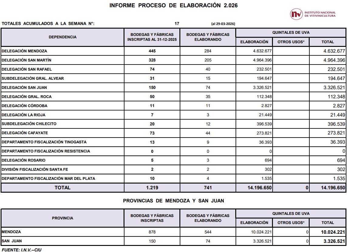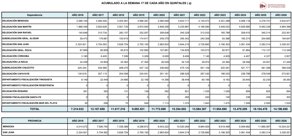 A continuación replicamos los cuadros estadísticos sobre la marcha de la cosecha de uva 2026 tras 17 semanas de recolección en Argentina, elaborados por el equipo técnico del Instituto Nacional de Vitivinicultura (INV).