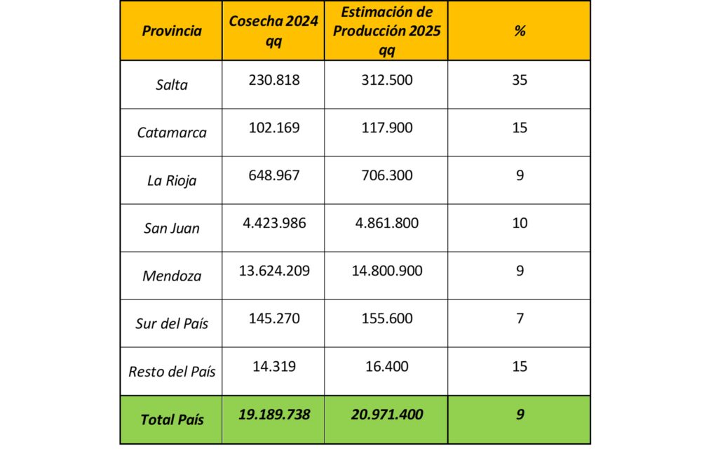 El Instituto Nacional de Vitivinicultura (INV) dio a conocer la estimación de producción de uva 2025 para todo el país, la proyección es un 9% mayor a la de 2024, con una cosecha de 20.971.400 qq. En todas las provincias el pronóstico es mayor al de la temporada anterior, incluso en San Juan con todas las contingencias sufridas.
