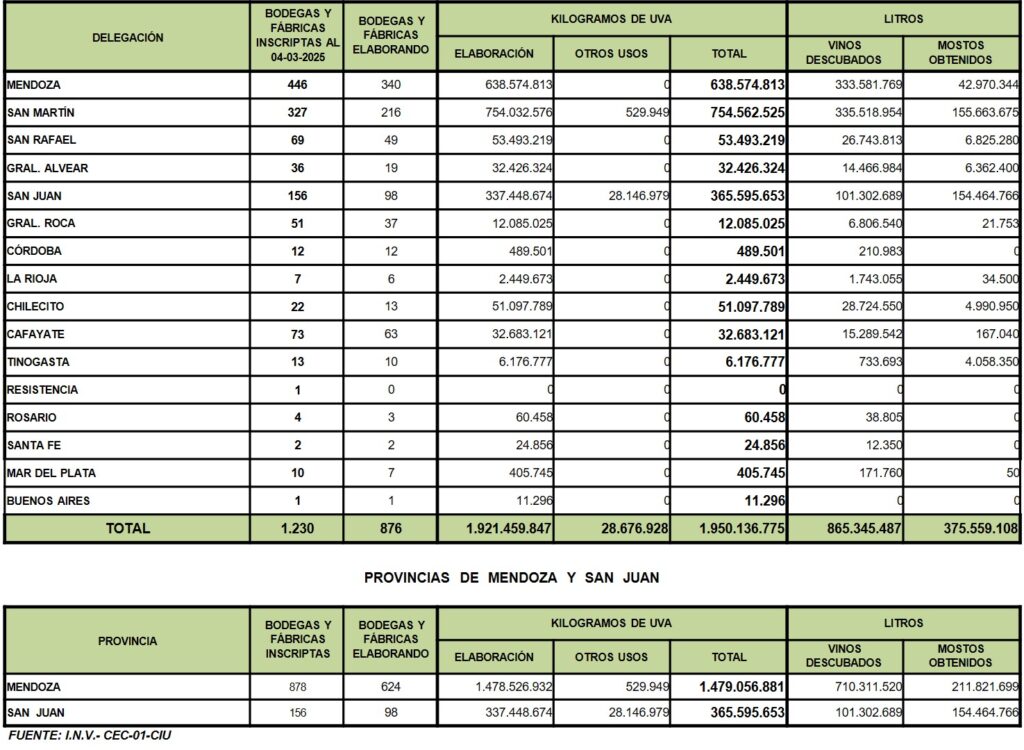 A continuación replicamos los cuadros estadísticos elaborados por el INV con los números de la cosecha de uva al 20/4/25.