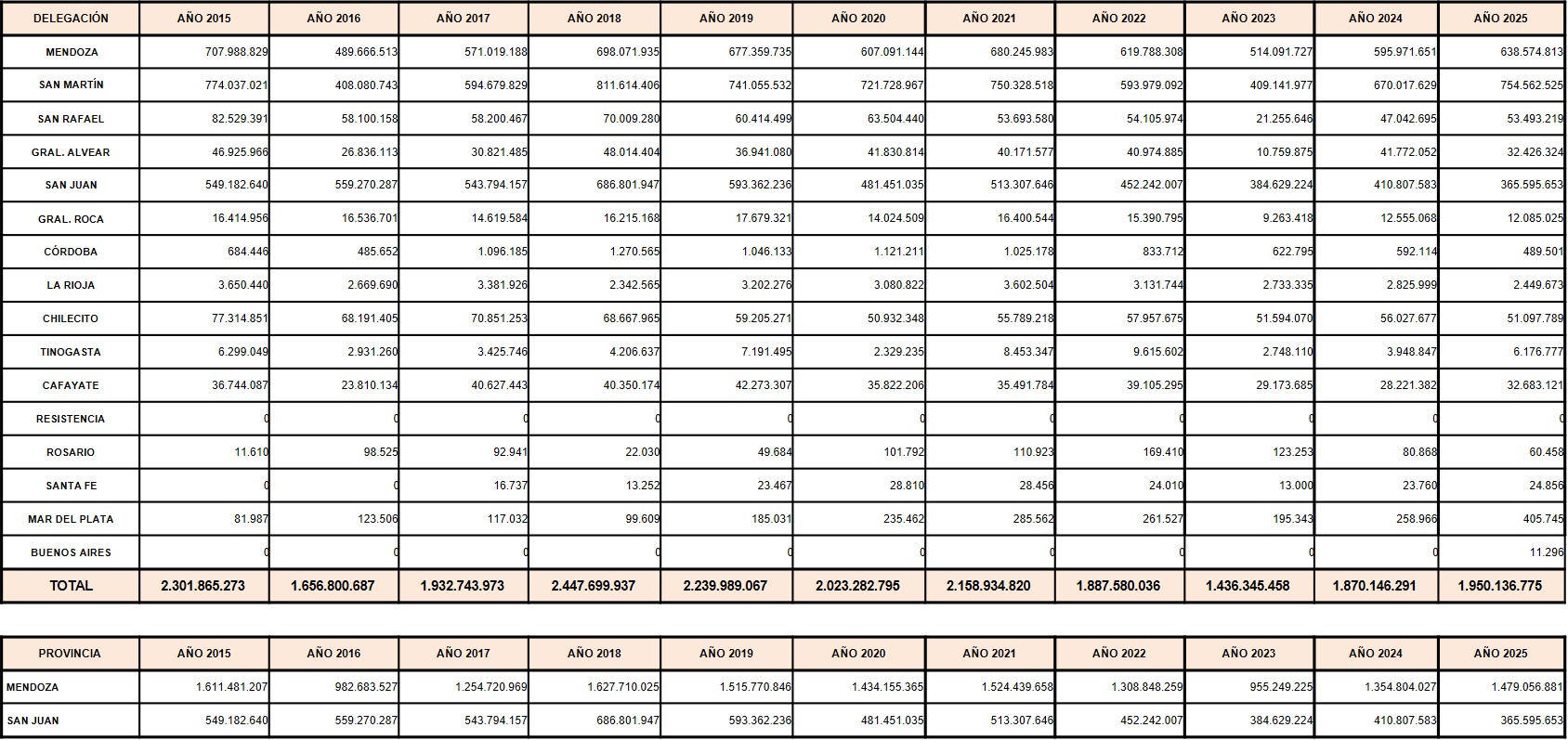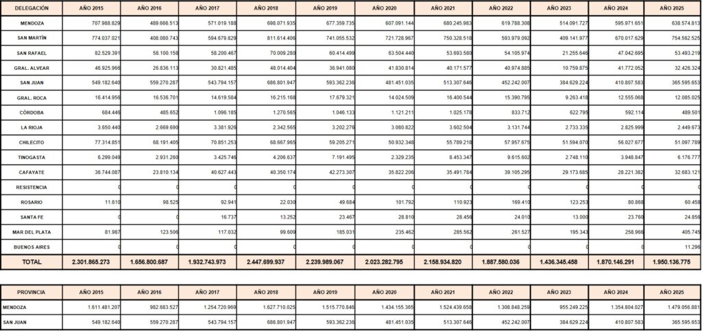 En cuanto a las dos principales provincias productoras, Mendoza tuvo un crecimiento del +9,2% con respecto a la misma semana de cosecha de 2024, con 1.479.056.881 kg. No es el caso de San Juan, que afectada por contingencias climáticas y un brote de peronóspora, redujo su cosecha un -11% con 365.595.653 kg.