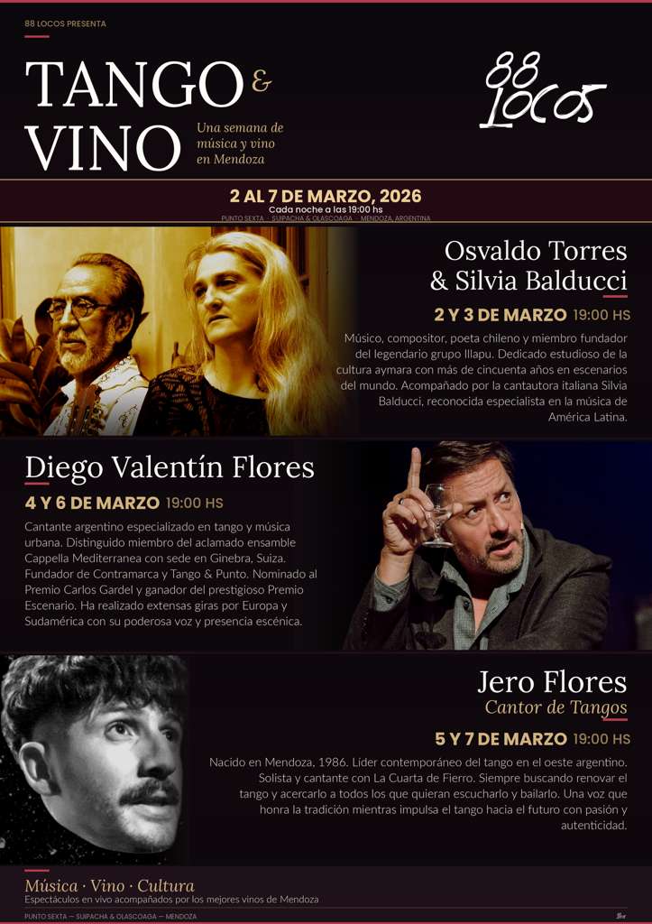 Los días 5 y 7 de marzo, siempre desde las 19 hs y en el Espacio 88 Locos, actuará el cantante y bailarín de tango Jero Flores, surgido de lo más profundo de la Cuarta de Fierro de Mendoza y también con proyeccion internacional.