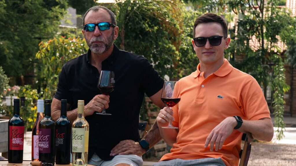 Artem Safonov (el ruso, obviamente, a la derecha de la foto principal) y Jeff McLoud (el «Gringo», como le gusta que lo llamen) son dos imparables emprendedores trotamundos que se conocieron en Mendoza en 2023 y se hicieron amigos, unidos por la pasión por el vino. Su visión de futuro y su enamoramiento de esta provincia los lanzó a la aventura de desarrollar su propia marca, 88 Locos. Hoy, 2/3, los dos socios ponen en escena su etiqueta de 6 opciones varietales en la vinoteca y espacio cultural que inauguran, ubicado en el centro comercial Punto Sexta (Suipacha y Olascoaga de la Capital de Mendoza). Las entradas pueden adquirirse por Entrada Web o llamando al móvil abajo consignado.