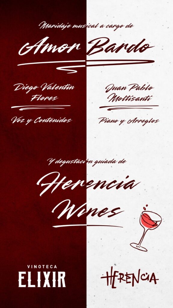 La música original y el buen vino, los intérpretes talentosos y las novedades en proyectos vitivinícolas, todo en un ambiente amigable, son una combinación atractiva para disfrutar en la Vinoteca Elixir. Allí, su propietario Juan Cruz Zuloaga recibe a los visitantes con una propuesta semanal de recitales en vivo y degustaciones de etiquetas novedosas. Es el caso, este jueves 25 de setiembre desde las 21.30 hs, del recital del dúo tanguero Amor Bardo, integrado por Diego Valentín Flores en canto y contenidos y Juan Pablo Moltisanti en piano y arreglos (foto principal).