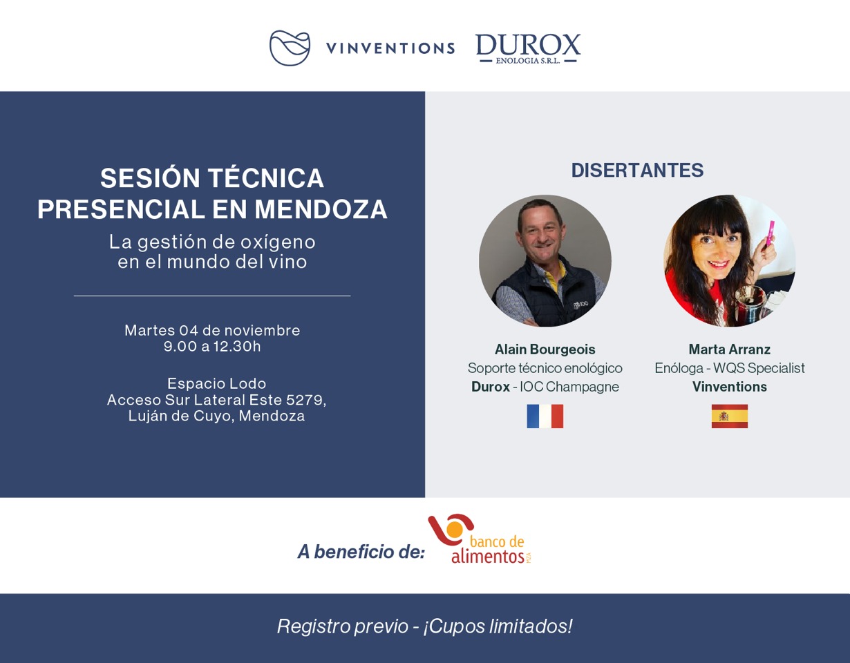 Por ese motivo, en esta oportunidad Vinventions se unió con la empresa Durox para organizar en conjunto una sesión técnica presencial en Mendoza sobre “La gestión del oxígeno en el mundo del vino”, con el objetivo de profundizar el conocimiento de los equipos profesionales de las bodegas y contribuir a la eficiencia de la administración del oxígeno a lo largo de todo el proceso de producción.