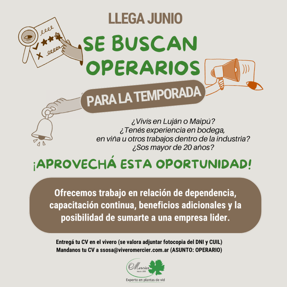Desde hace más de 25 años en Argentina y Mendoza, Vivero Mercier se ha consolidado como referente en la producción de plantas de vid. Ese mismo compromiso lo trasladan a sus formas de vincularse con la comunidad y con quienes van integrando sus equipos de trabajo. Así que para aquellos que estén buscando nuevos desafíos en un entorno donde se valora el esfuerzo, la colaboración y el aprendizaje continuo, esta puede ser una buena oportunidad.